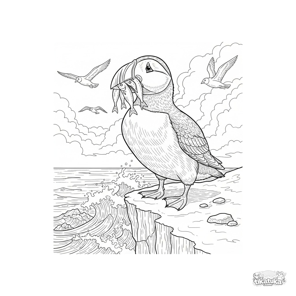 Schwieriges Ausmalbild für Kinder von 7-12 Jahren mit einem Papageitaucher. Der Vogel mit gefangenem Fisch im Schnabel steht am Rand einer felsigen Klippe über dem tosenden Meer.