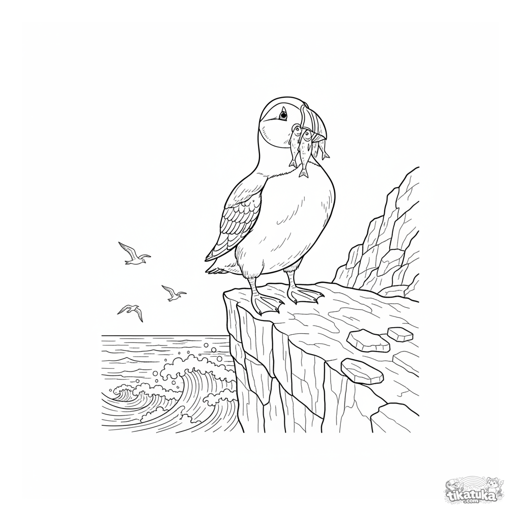 Schwieriges Ausmalbild für Kinder von 7-12 Jahren: ein Papageitaucher mit Fisch auf einer felsigen Klippe. Detaillierter Hintergrund mit Wellen und Felsstrukturen.