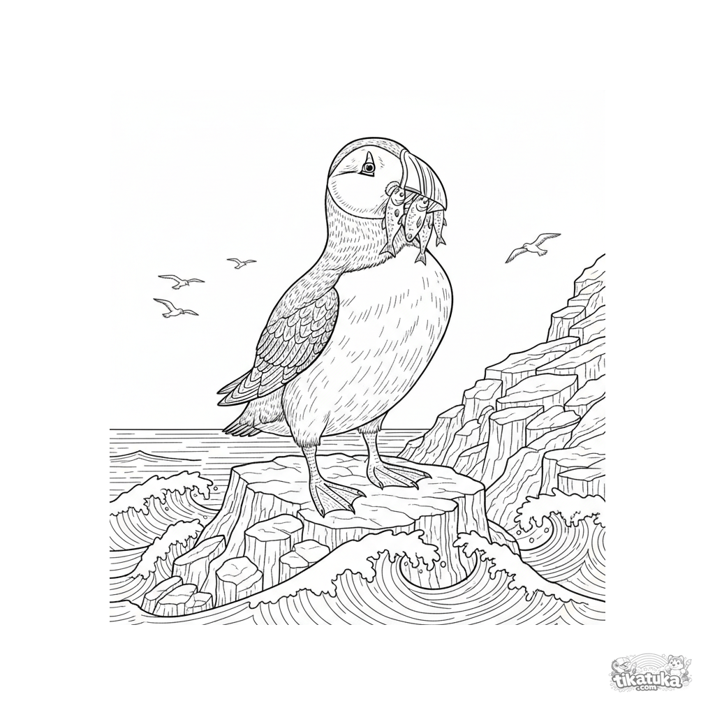 Detailliertes Ausmalbild für ältere Kinder von 7-12 Jahren mit einem Papageitaucher auf einer Klippe. Komplexer Hintergrund mit Wellen und Himmel.