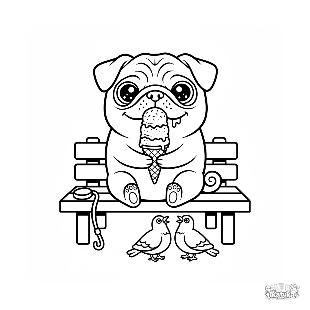 Kleinkind Ausmalbild 2-3 Jahre: ein lustiger Mops mit Eis sitzt auf einer Bank. Sehr einfache, große Formen, Chibi-Stil.