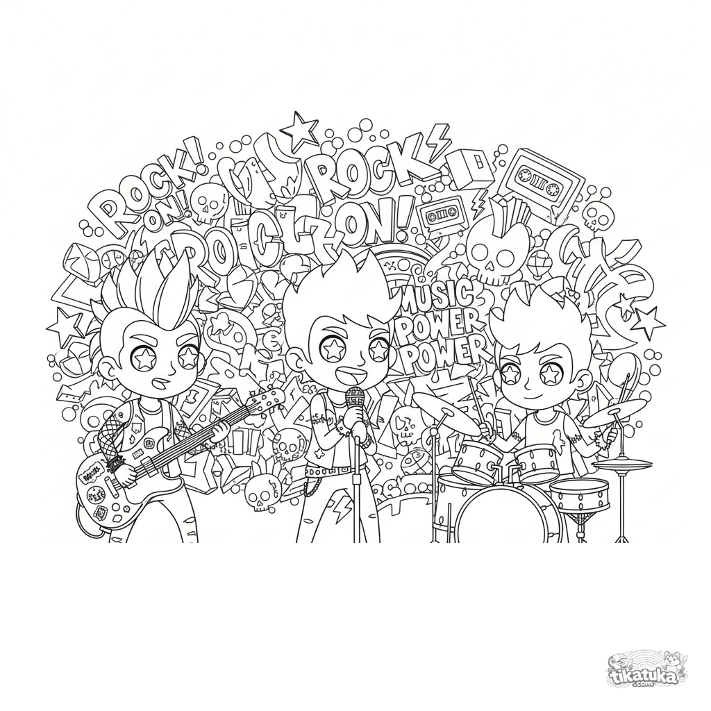 Ausmalbild für Kinder von 7-12 Jahren: Eine Punk-Lite-Band mit drei Mitgliedern probt vor einer großen Graffiti-Wand. Detaillierte Szene mit beklebter Gitarre, Mikrofonständer und Schlagzeug.