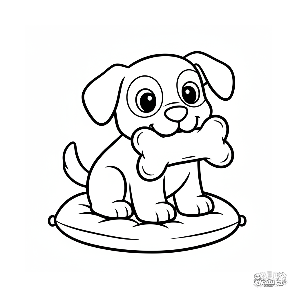 Ausmalbild für die Jüngsten (2-3 Jahre): ein fröhlicher Welpe in Holzspielzeug-Form sitzt auf einem Kissen und hält ein Knochenkissen. Einfache geometrische Formen.