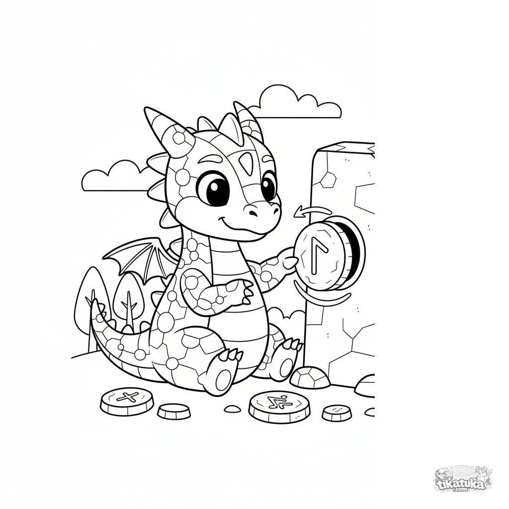 Ausmalbild für Tweens von 7-9 Jahren: ein Drache mit Puzzle-Stück-Schuppen versucht, einen Runenschlüssel in einen alten Monolithen zu passen. Interessantes geometrisches Thema und Geschichte.