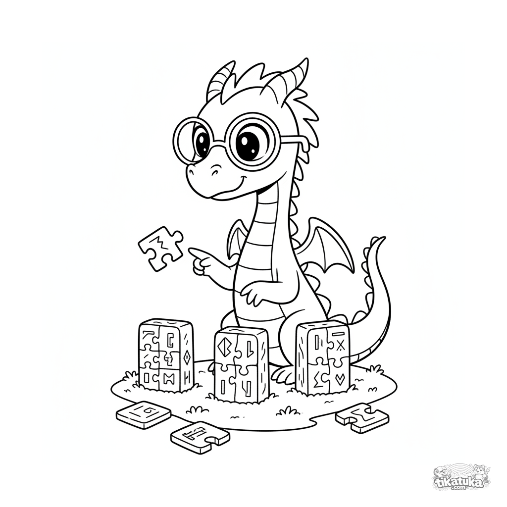 Ausmalbild für 7-9 Jahre: Ein schlauer Drache mit Brille löst ein Glyphenrätsel an alten Monolithen.