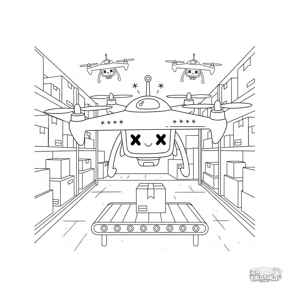 Ausmalbild für Kinder 7-9: Eine glatte Quadcopter-Drohne schwebt in einem Lagerhaus, um ein Paket vom Förderband aufzunehmen. Klare Umrisse, mäßiges Detail, breite Ränder.