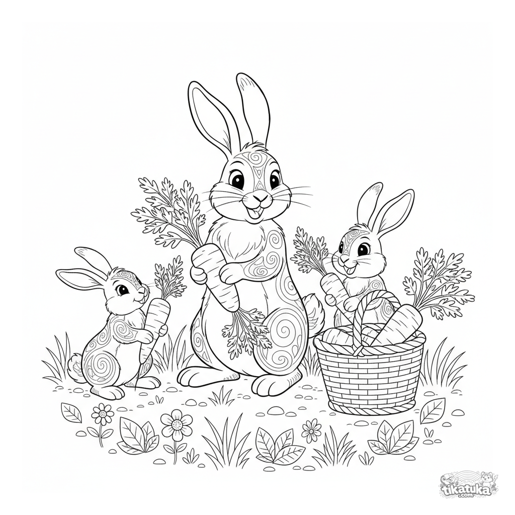 Detailliertes familien- und herbstliches Ausmalbild: Kaninchen arbeiten zusammen, um Karotten auf einer Wiese zu ernten. Viele Details, geeignet für Kinder 7-12.