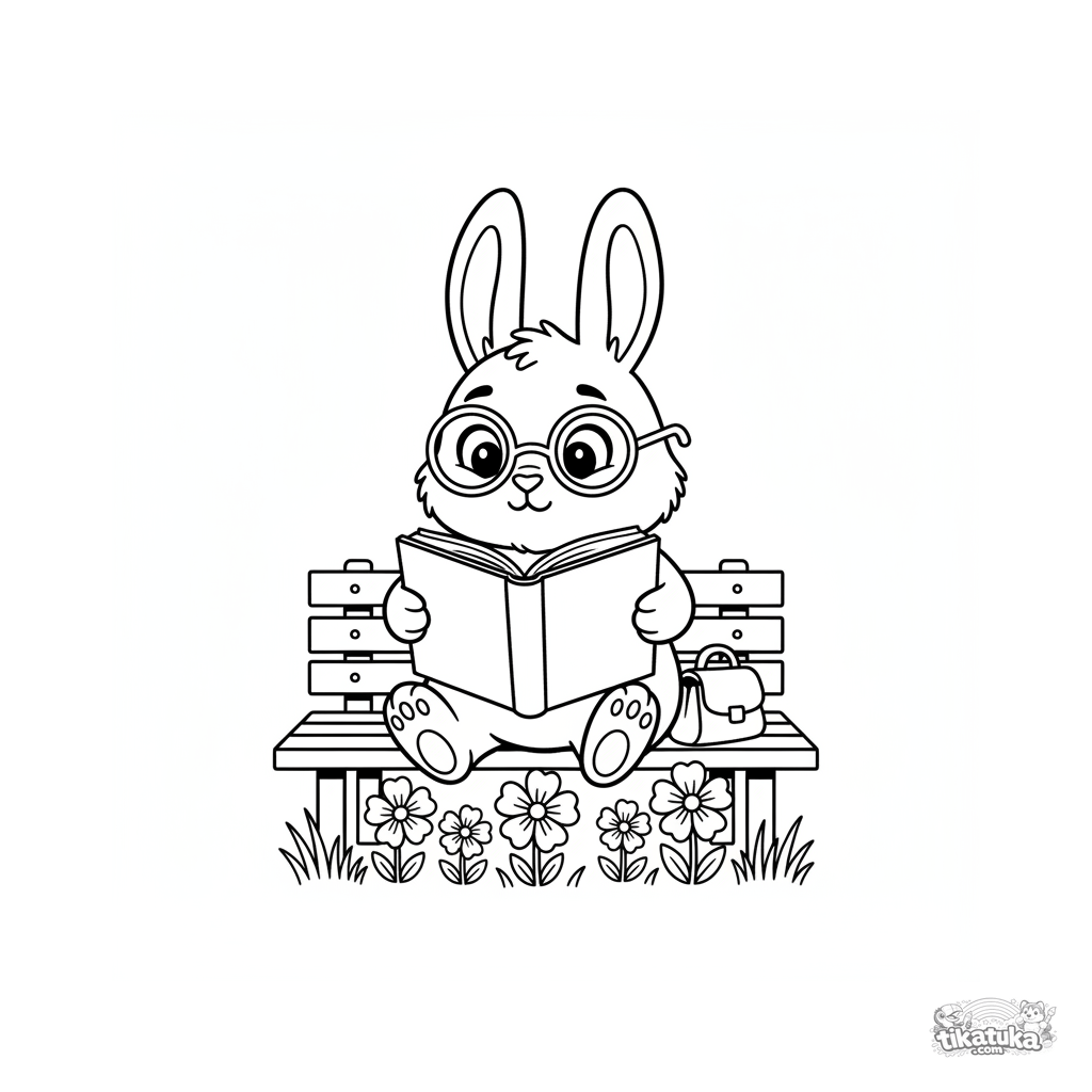 Einfaches Ausmalbild für Kleinkinder 2-3: Ein niedlicher Hase mit Brille sitzt auf einer Bank und liest ein großes Buch. Große Formen, wenige Details.
