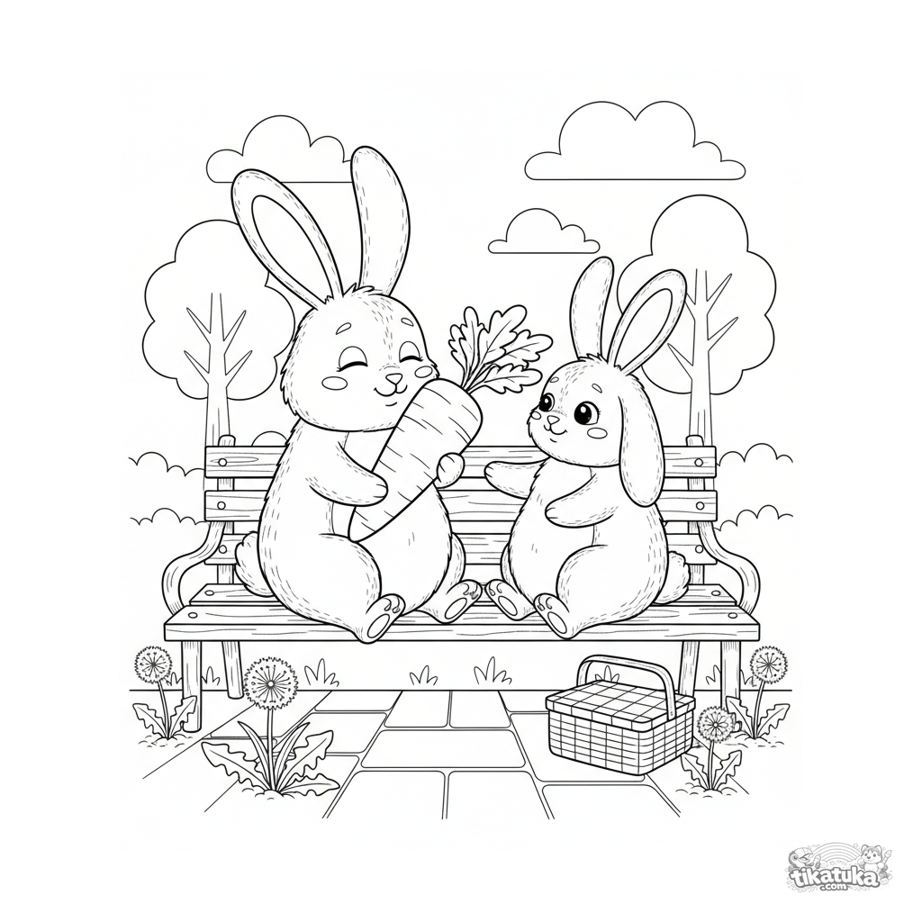 Ausmalbild für Kinder 4-6: Zwei Kaninchen sitzen auf einer Parkbank und teilen eine Karotte. Süße Freundschaftsszene mit klaren Details.