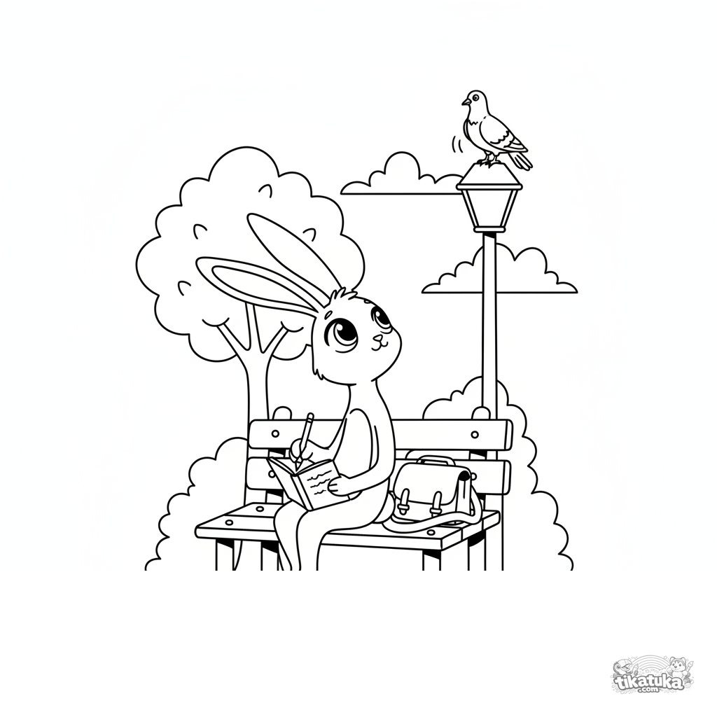 Ausmalbild für 7-9 Jahre: Ein künstlerischer Hase sitzt auf einer Parkbank und zeichnet. Dynamische Pose, Umhängetasche und Papierkugeln.