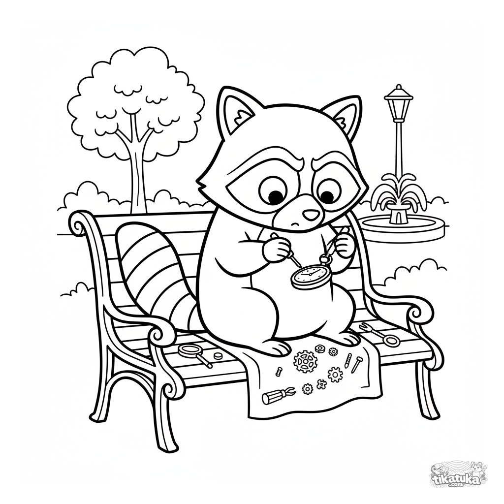 Ausmalbild für Kinder 7-9: Ein bastelnder Waschbär repariert eine Taschenuhr auf einer Parkbank. 90er-Jahre-Stil.