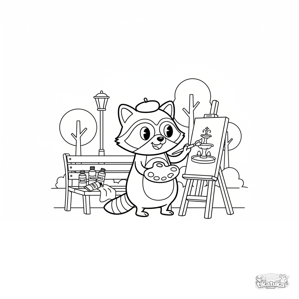 Ausmalbild für Kinder 7-9: Ein Waschbär mit Baskenmütze malt an einer Staffelei. Dynamische Pose, Retro-Stil.
