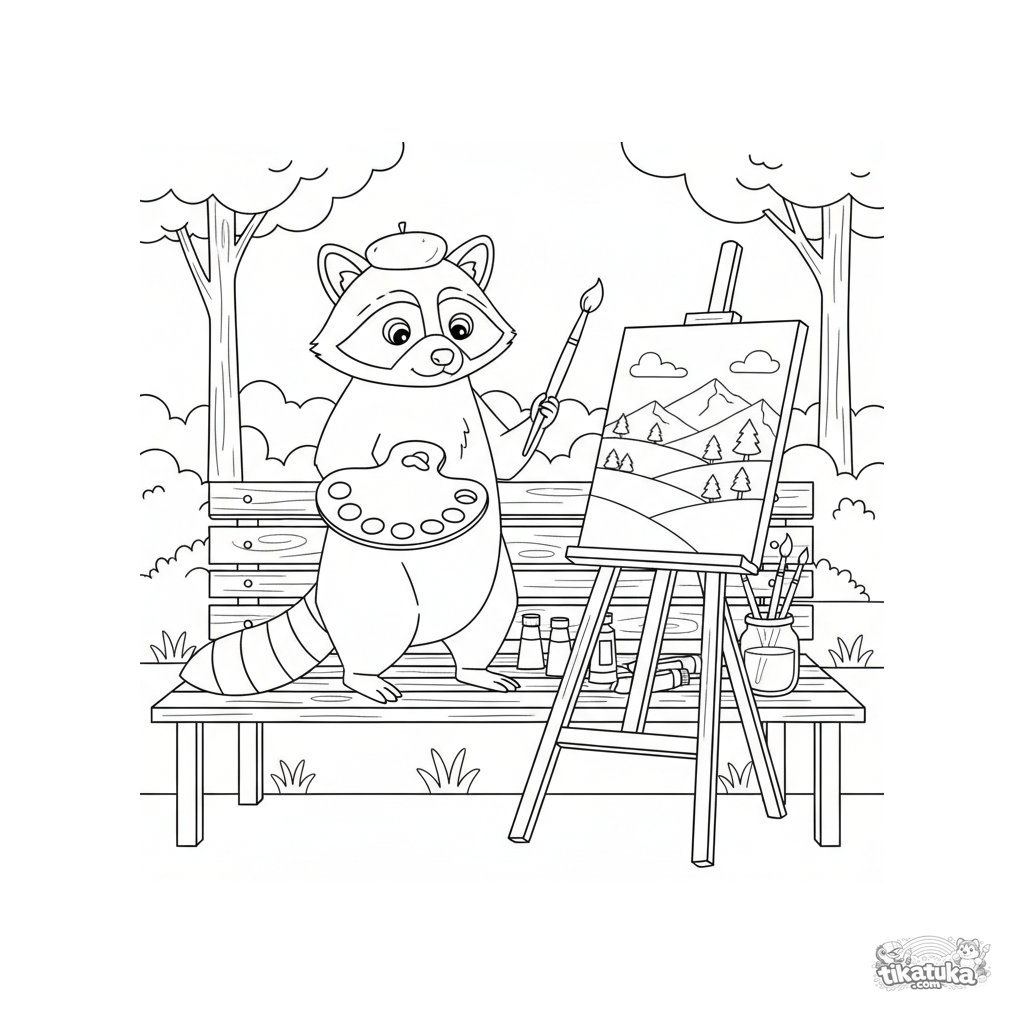 Ausmalbild für ältere Kinder 10-12: Ein Waschbär-Maler erschafft eine Landschaft an einer Staffelei auf einer Parkbank. Detaillierte realistische Szene im Stadtpark.
