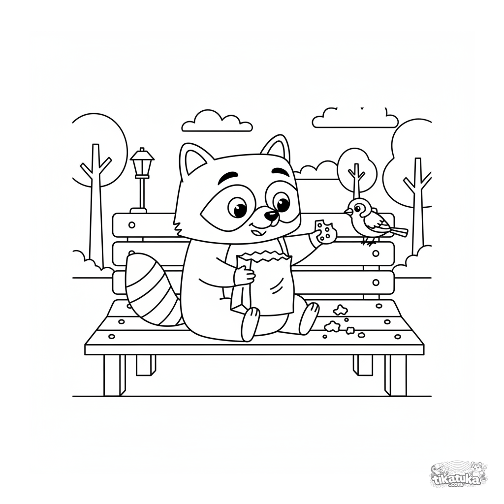 Ausmalbild für Kinder 7-9: Ein fröhlicher Waschbär auf einer Parkbank teilt einen Snack mit einem kleinen Spatz. Eine Szene der Freundschaft und Großzügigkeit.