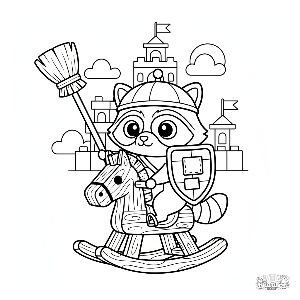 Ausmalbild für Jungen 4-6: Waschbär Shmyak als Ritter auf einem Spielzeugpferd.