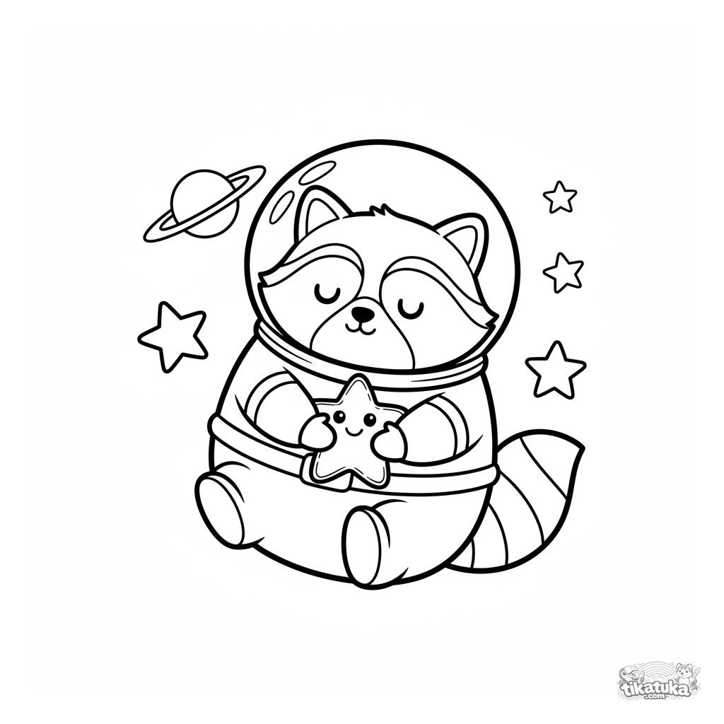 Weltraum-Ausmalbild für Kinder von 4-6 Jahren: Astronaut-Waschbär Shmyak im Raumanzug schwebt fröhlich in der Schwerelosigkeit und hält ein sternförmiges Alien-Plüschtier.
