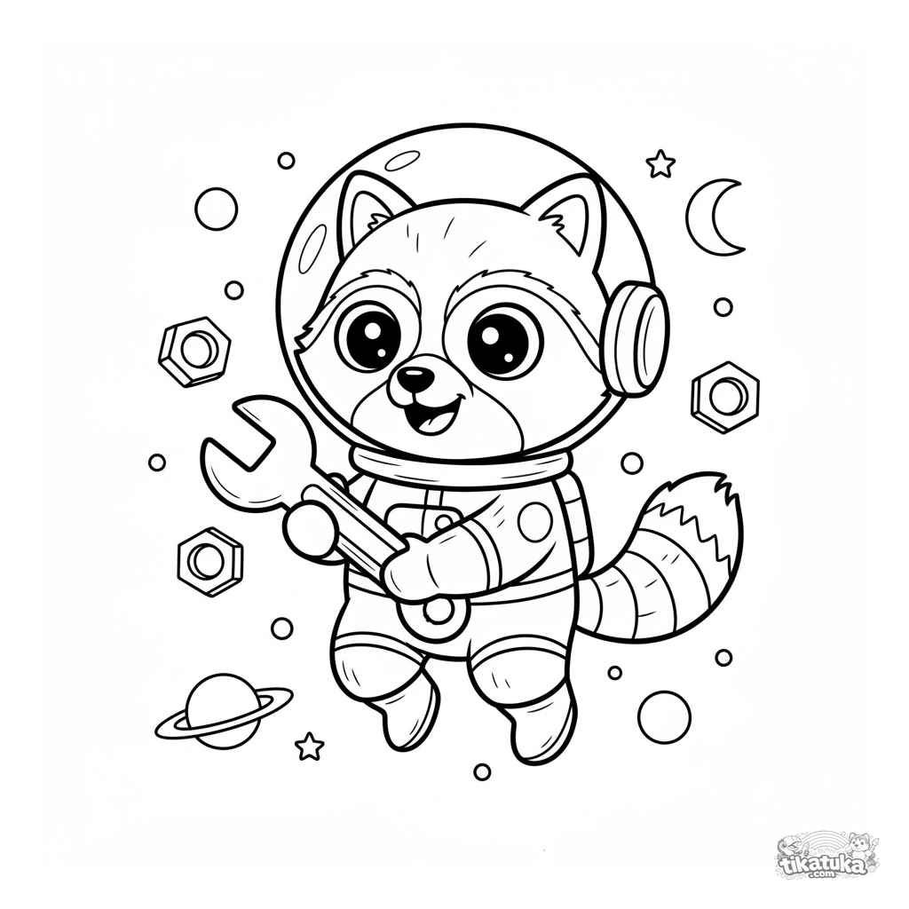 Ausmalbild für Kinder von 4-6 Jahren: Astronaut-Waschbär Shmyak schwebt in Schwerelosigkeit mit einem Schraubenschlüssel und repariert etwas. Lustige Weltraumszene.