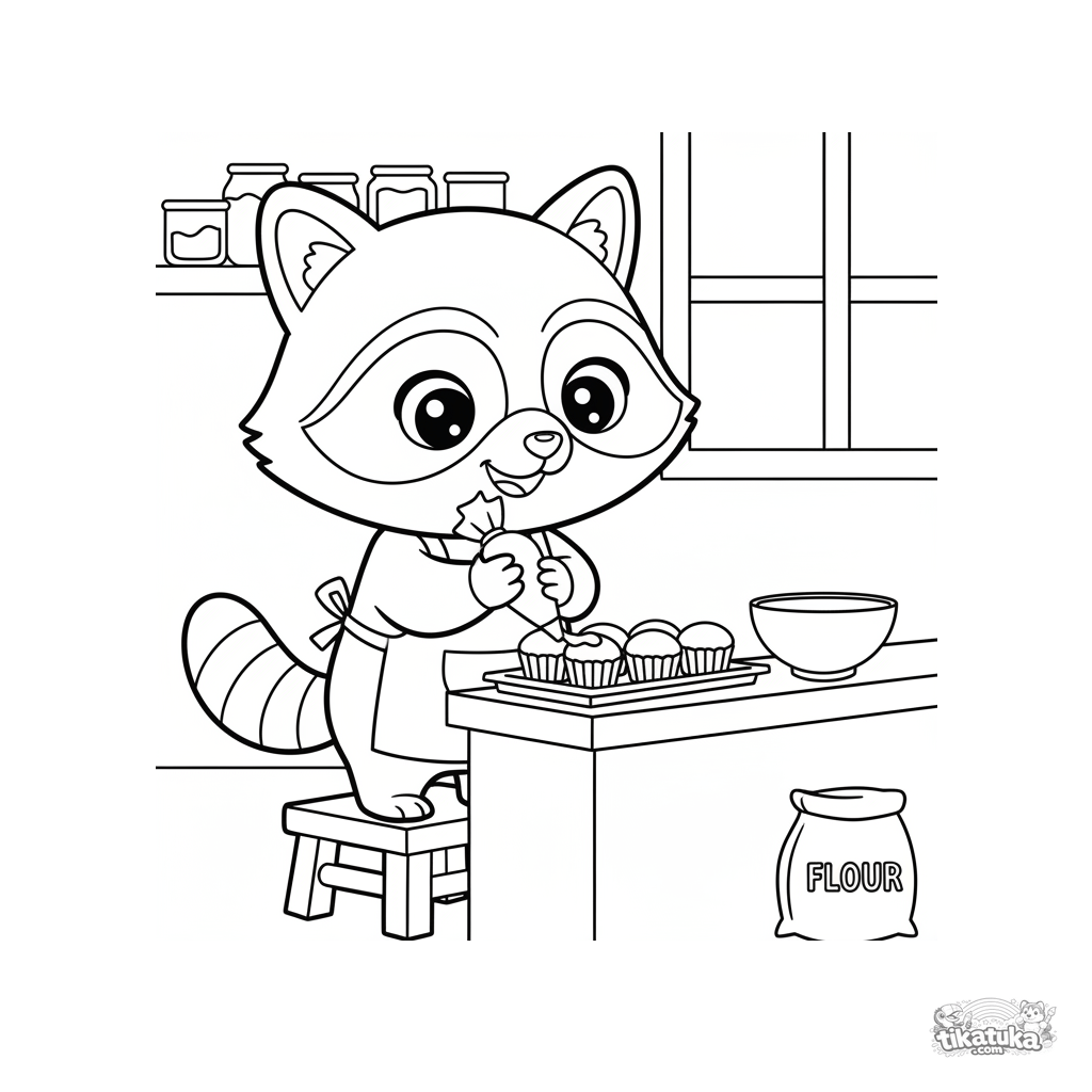 Leckeres Ausmalbild für Kinder 4-8: Erfinder-Waschbär Shmyak mit einer kleinen Schürze verziert frisch gebackene Cupcakes mit Zuckerguss in der Küche.