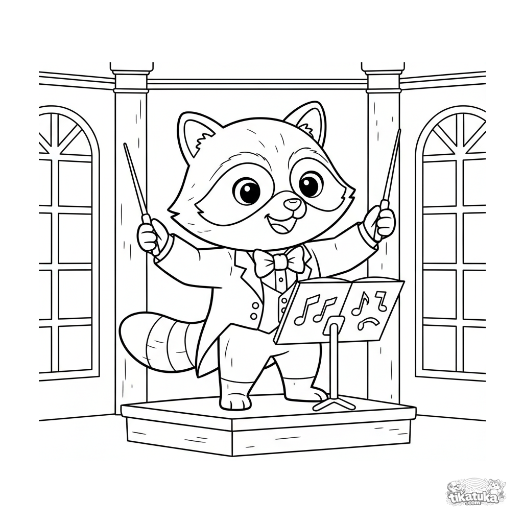 Ausmalbild für Kinder: Waschbär Shmyak im Smoking dirigiert ein Orchester in einer großen Konzerthalle. Dynamische Pose, einfache Details, für 4-8 Jahre.