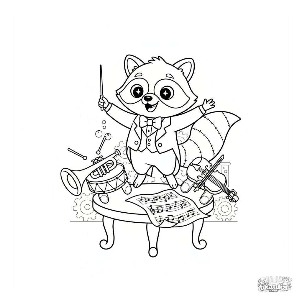 Ausmalbild mit Dirigent-Waschbär Shmyak, der ein Spielzeugorchester leitet. Für Kinder von 4 bis 8 Jahren.