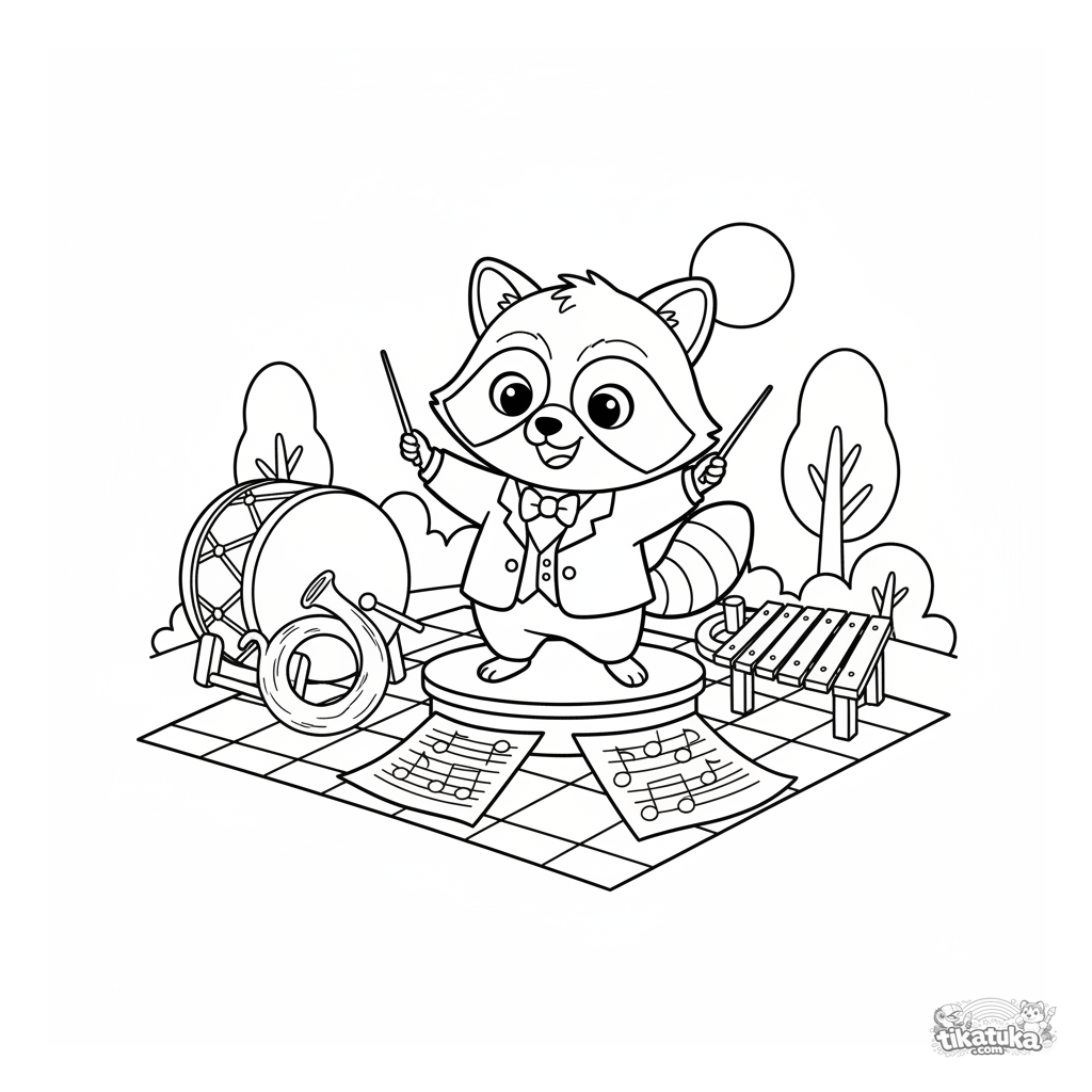 Ausmalbild mit Waschbär Shmyak als Dirigent, der ein fröhliches Spielzeugorchester leitet. Für Kinder von 4-8. Eine Szene mit Musikinstrumenten und einem Notenblatt.