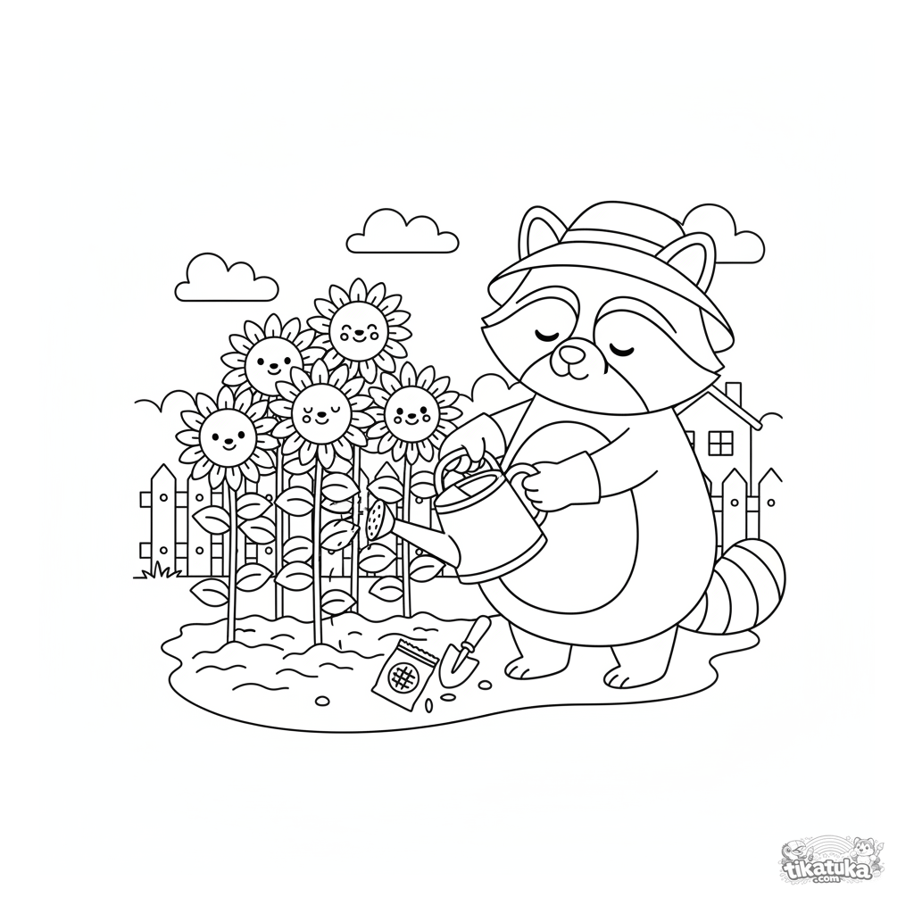Ausmalbild für Kinder: Waschbär Shmyak mit Gartenhandschuhen und Hut gießt hohe Sonnenblumen in einem Garten. Friedliche Szene, einfache Formen, für 4-8 Jahre.