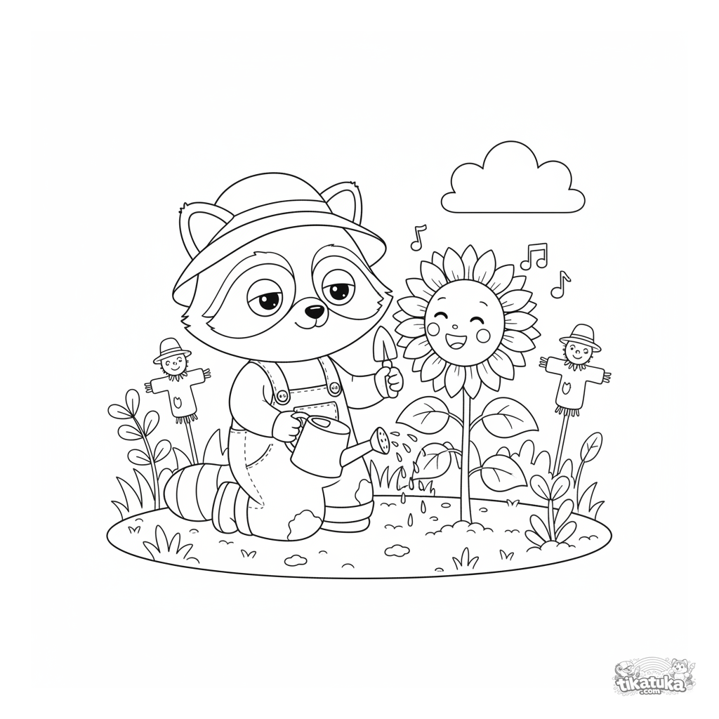 Ausmalbild mit Gärtner-Waschbär Shmyak, der sich um eine singende Sonnenblume kümmert. Für Kinder von 4 bis 8 Jahren.