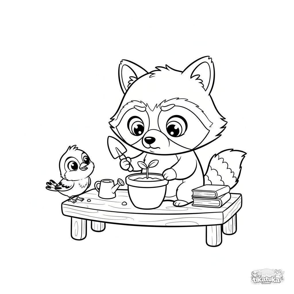 Ausmalbild für Kinder von 4-6 Jahren: Erfinder-Waschbär Shmyak pflanzt eine Blume in einen Topf, während ein kleiner Vogel zusieht. Einfache Linien, niedliche Szene.