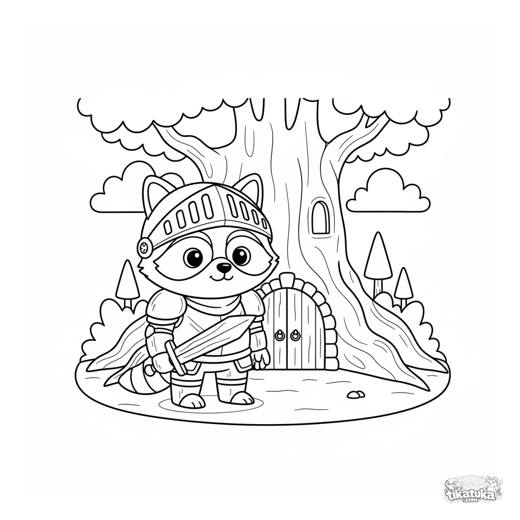 Ausmalbild mit Ritter-Waschbär Shmyak, der ein winziges Burgtor bewacht. Für Jungen von 4 bis 8 Jahren.