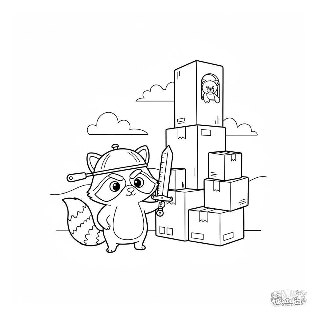 Ausmalbild für Jungen von 4-6 Jahren: Ritter-Waschbär Shmyak mit einem Topfhelm rettet einen Stoffbären aus einer Pappburg. Dynamische, aber einfache Szene.