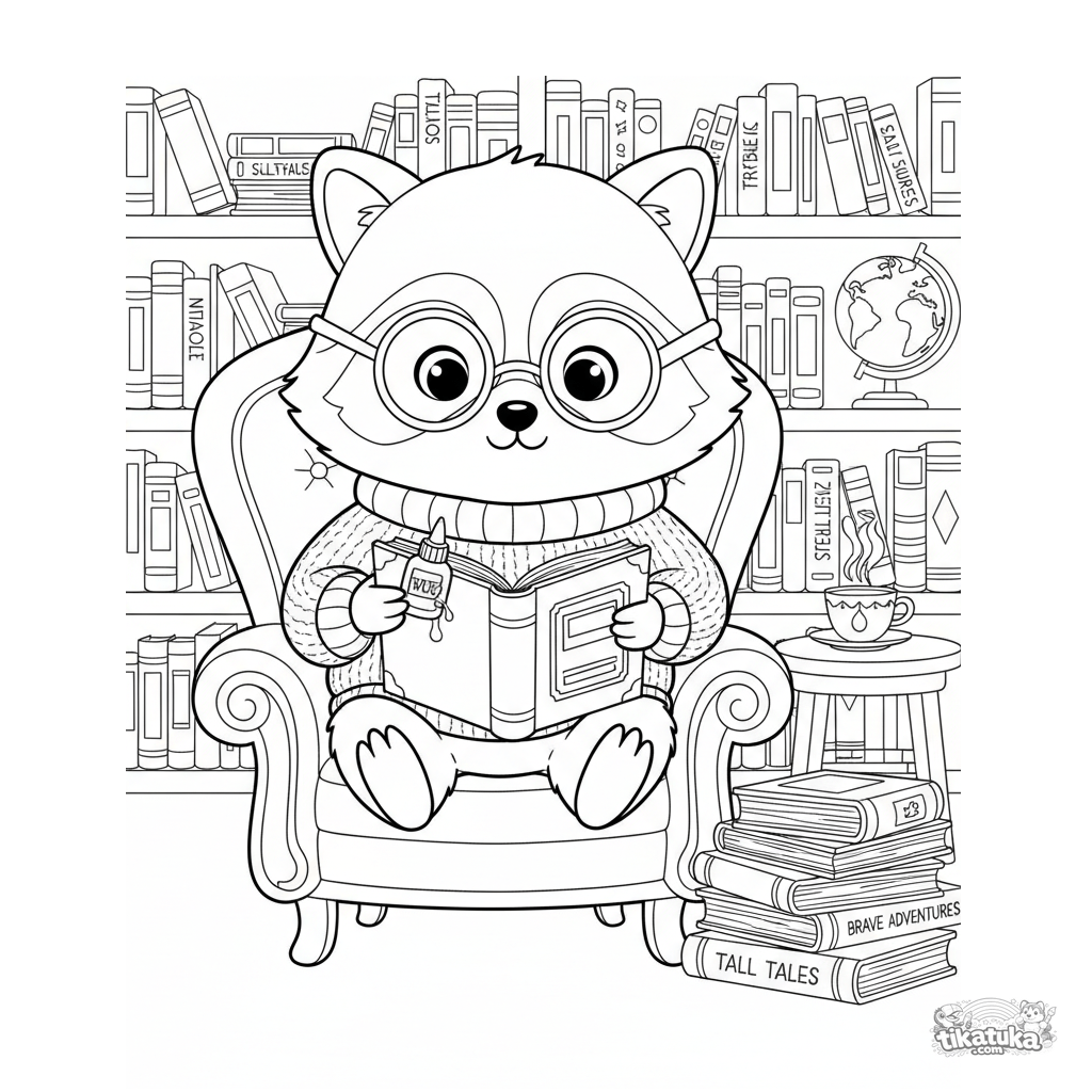 Ausmalbild mit Bibliothekar-Waschbär Shmyak in einer gemütlichen Leseecke. Für Kinder von 4 bis 8 Jahren.