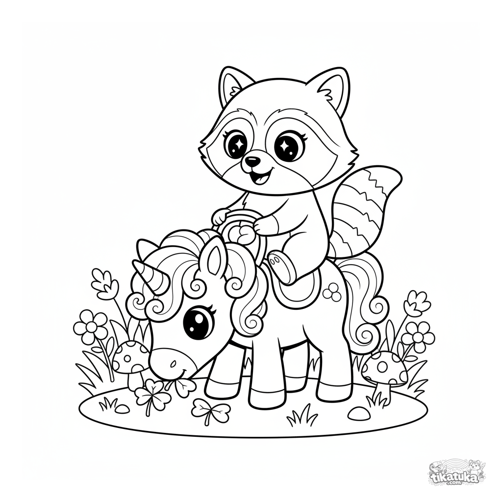 Ausmalbild für Mädchen von 4-6 Jahren: Waschbär Shmyak reitet ein freundliches, magisches Pony mit lockiger Mähne auf einer blühenden Wiese.