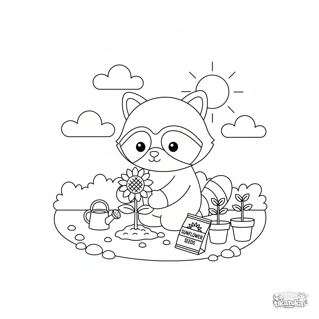 Ausmalbild für Kinder 4-6: Waschbär Shmyak pflanzt zärtlich einen Sonnenblumensetzling in einen Garten.
