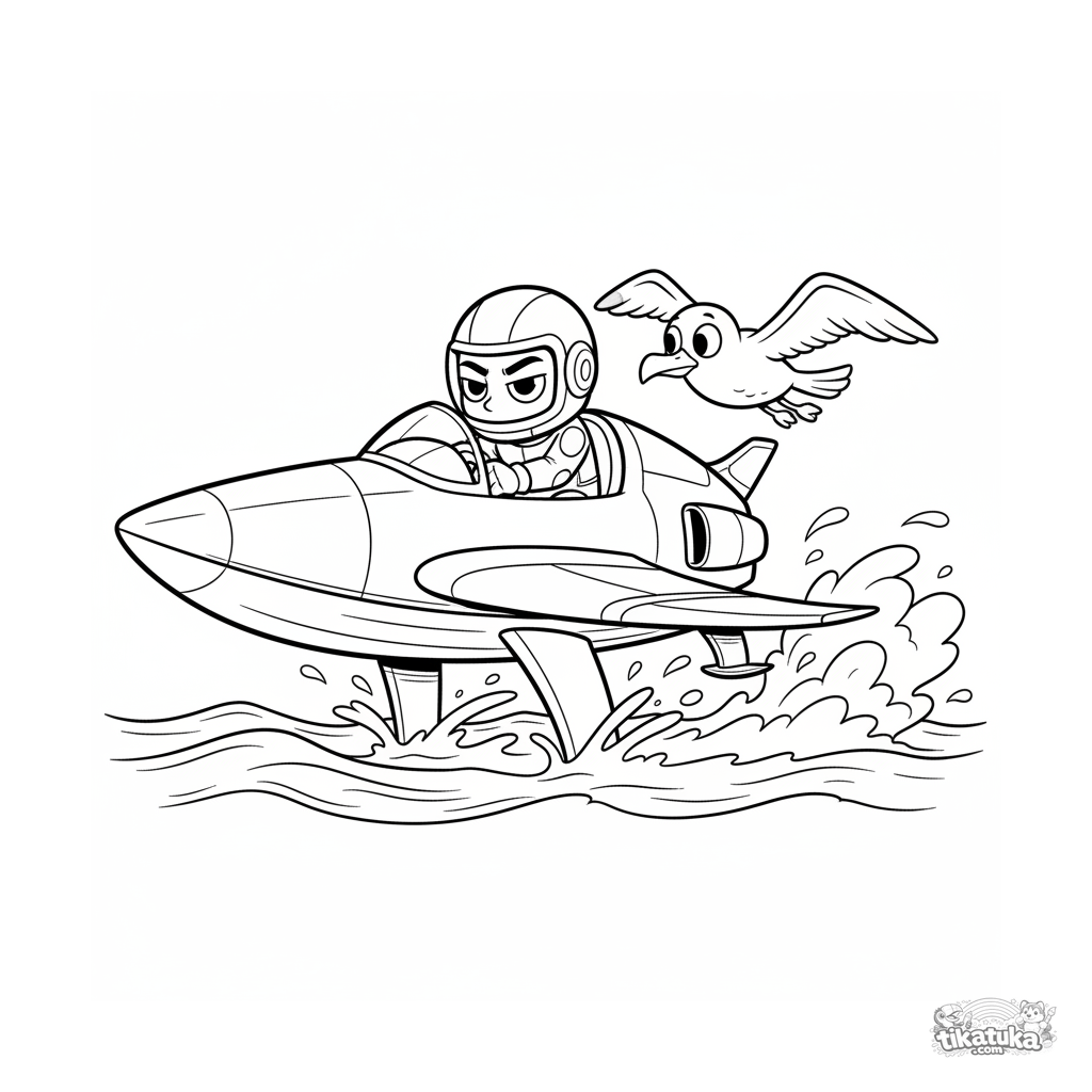 Ausmalbild für Tweens 7-9: Ein stromlinienförmiges Renn-Hydrofoil fliegt mit hoher Geschwindigkeit über Meereswellen. Dynamische Pose, Gischt und eine Möwe erzeugen Bewegung.