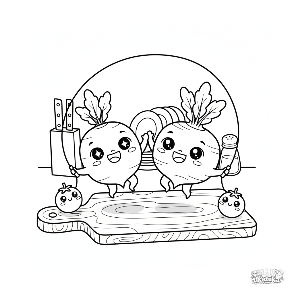 Ausmalbild eines Rettichs und einer Rübe, die zusammen Seil springen. Für Kinder von 4-6 Jahren. Fröhliche Gemüsefreunde auf einem Schneidebrett.
