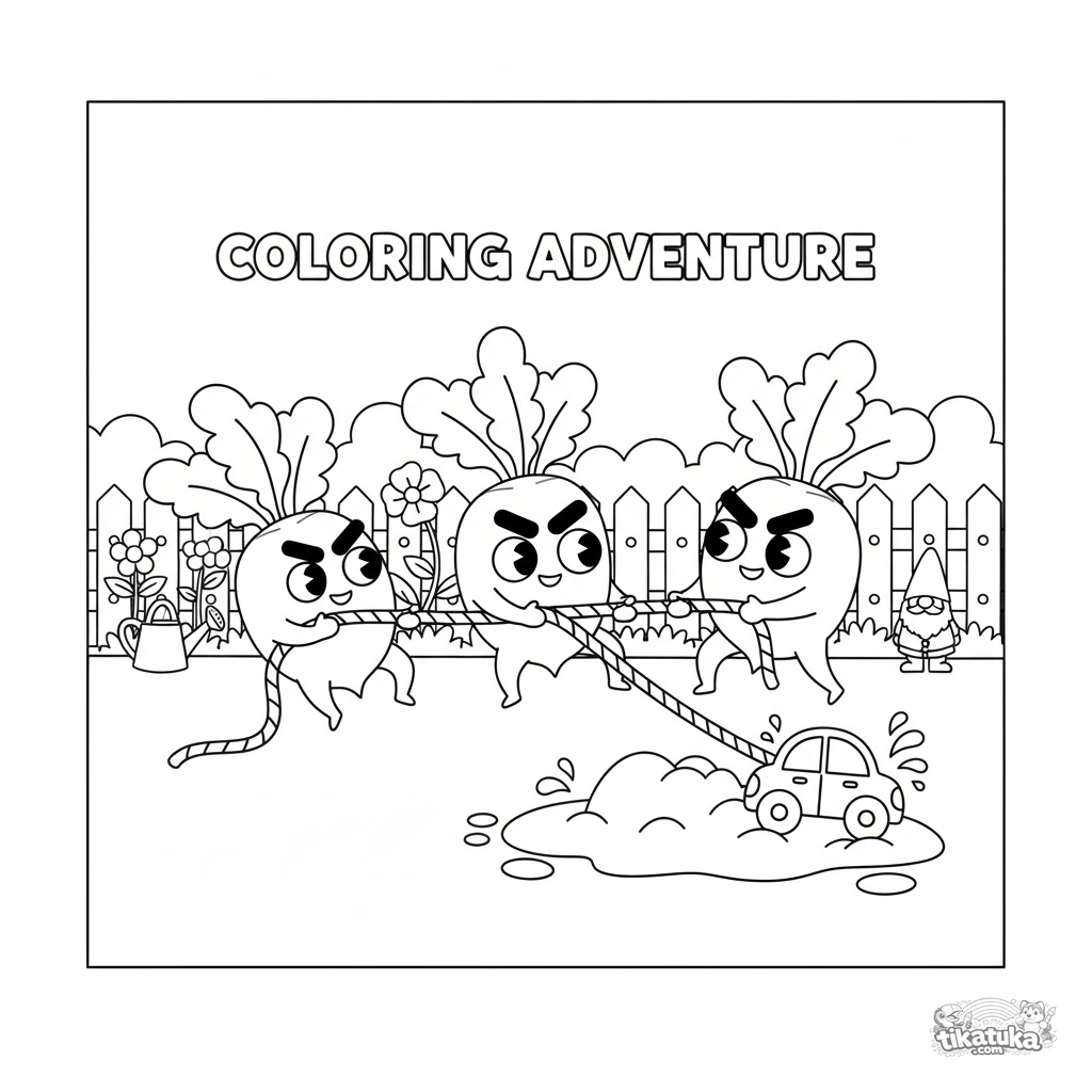Ausmalbild: Eine Rettich-Familie zieht auf einem Abenteuer ein Spielzeugauto aus dem Schlamm. Für Kinder von 7-9 Jahren.