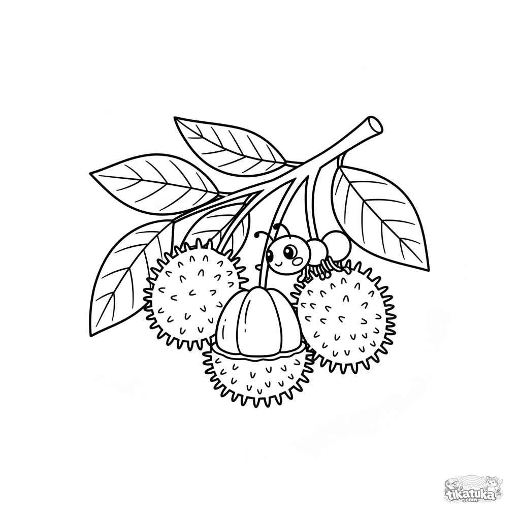 Ausmalbild für Kleinkinder: Ein Ast mit stacheligen Rambutans und einer winzigen freundlichen Ameise. Große, einfache Formen, minimale Details.