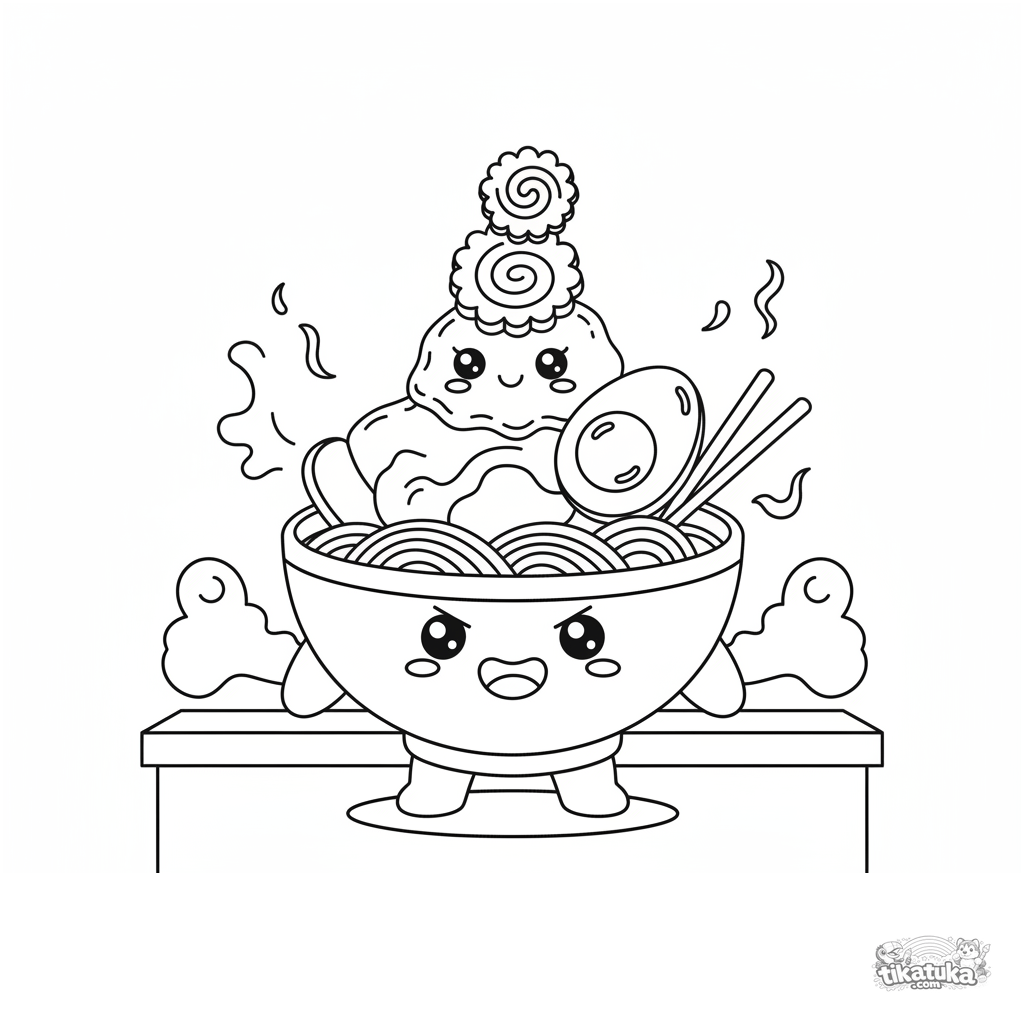 Ausmalbild einer Ramen-Schüssel, die Belag balanciert. Die Nudelschüssel hält ein Ei und Fischkuchen. Für Kinder 4-6.