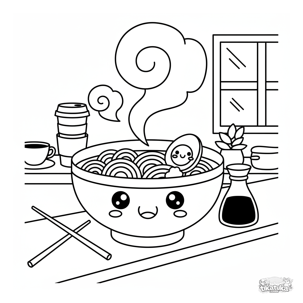 Ausmalbild einer Ramen-Schüssel, die auf einem Cafétresen feiert. Für Kinder von 4-6 Jahren. Zeigt eine lächelnde Schüssel mit Nudeln, einem Ei und einem fröhlichen Dampfwirbel.
