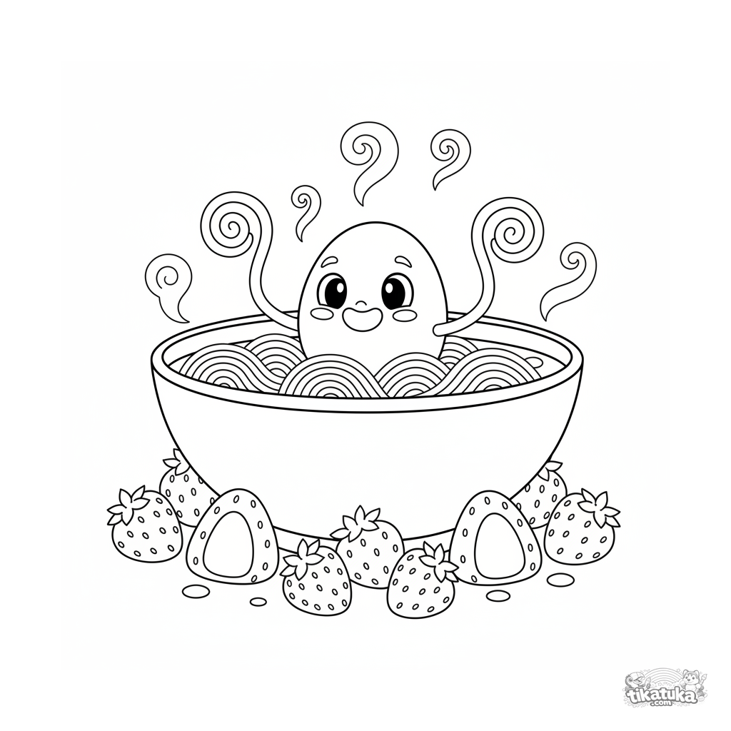 Ausmalbild für Kinder 4-6: Eine lächelnde Ramen-Schüssel sitzt in einem Feld aus Erdbeer-Mochi. Weiche Linien und freundlicher Ausdruck.