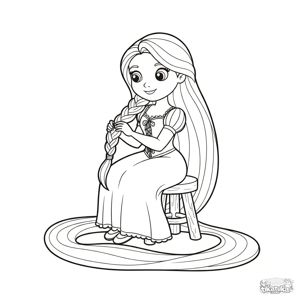 Ausmalbild für Kinder. Rapunzel im Turm flechtet ihr extrem langes blondes Haar. Einfaches Design für Kleinkinder. Kostenlos herunterladen.