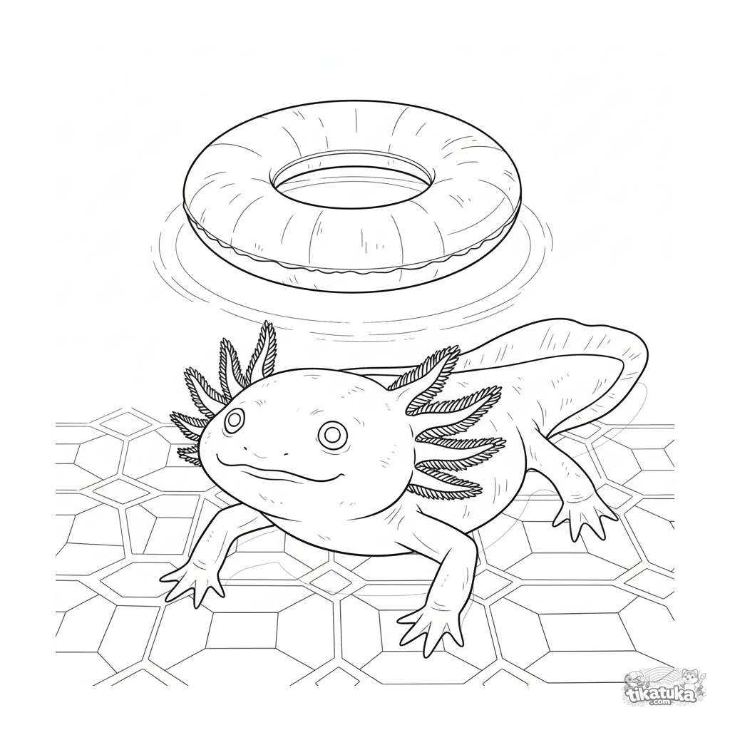 Detailliertes Ausmalbild eines realistischen Axolotls am Poolboden. Für ältere Kinder von 10-12 Jahren.