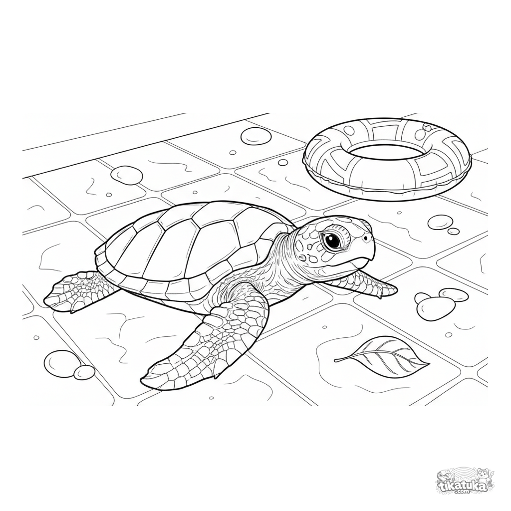 Detailliertes Ausmalbild für Kinder von 10 bis 12 Jahren: eine realistische Baby-Schildkröte erkundet einen Schwimmring am Poolboden.