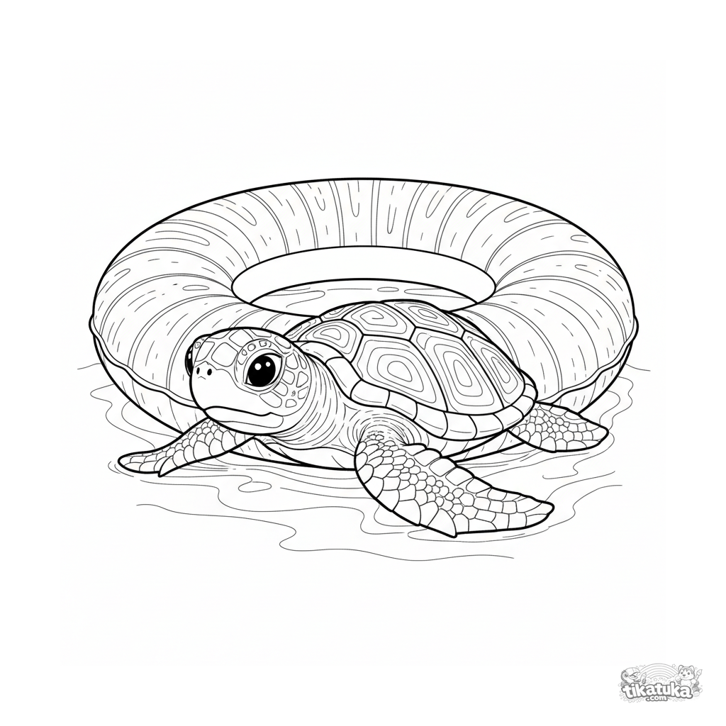 Ausmalbild für ältere Kinder 10-12: eine realistische Baby-Schildkröte mit gemustertem Panzer lugt unter einem Schwimmring am Poolboden hervor. Detaillierte Darstellung, natürliche Formen.