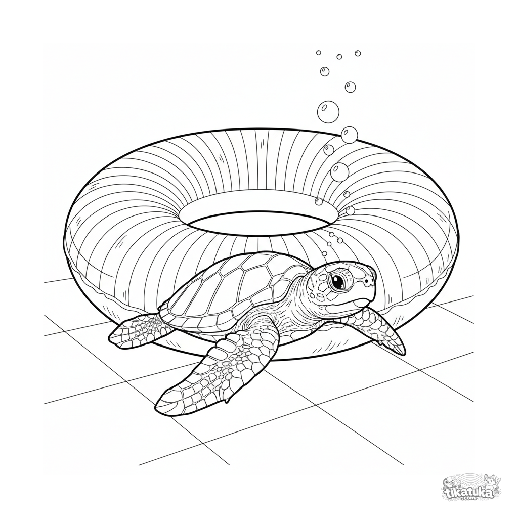 Detailliertes Ausmalbild für Kinder von 10-12 Jahren: Eine Babyschildkröte schwimmt unter einem Schwimmring. Realistische Umrisse, anatomische Details.