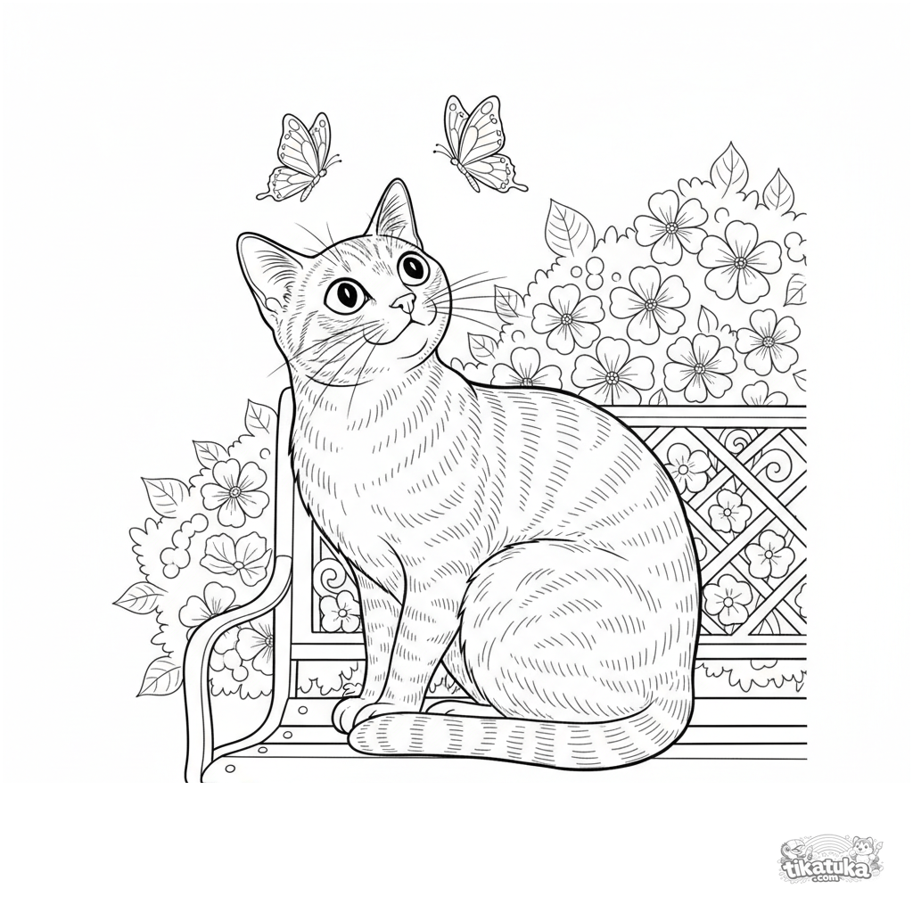 Detailliertes realistisches Ausmalbild für Kinder von 10-12 Jahren: Eine Katze beobachtet aufmerksam flatternde Schmetterlinge auf einer schmiedeeisernen Parkbank.