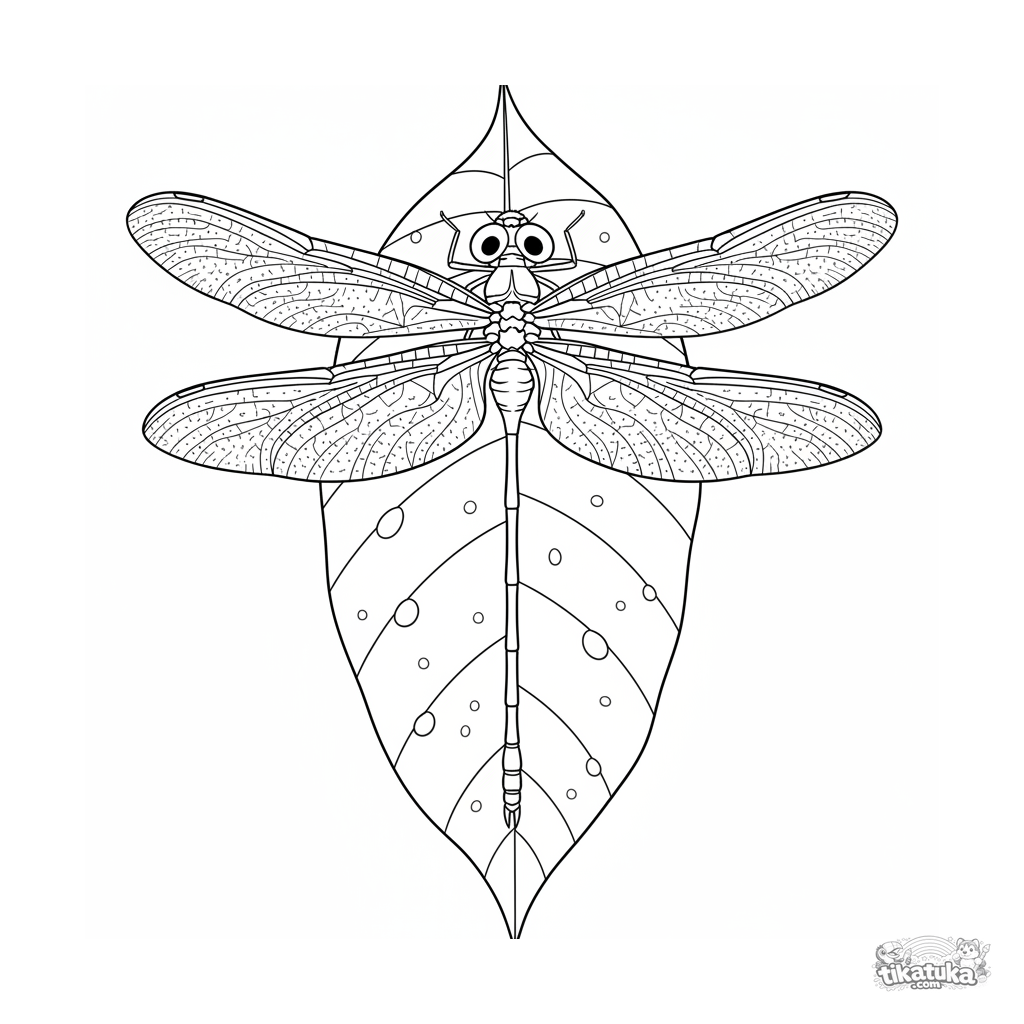 Ausmalbild für 10-12 Jahre: eine realistische Libelle mit detaillierten Flügelmustern sitzt auf der Ader eines großen, taufeuchten Blattes. Hoher Detaillierungsgrad.