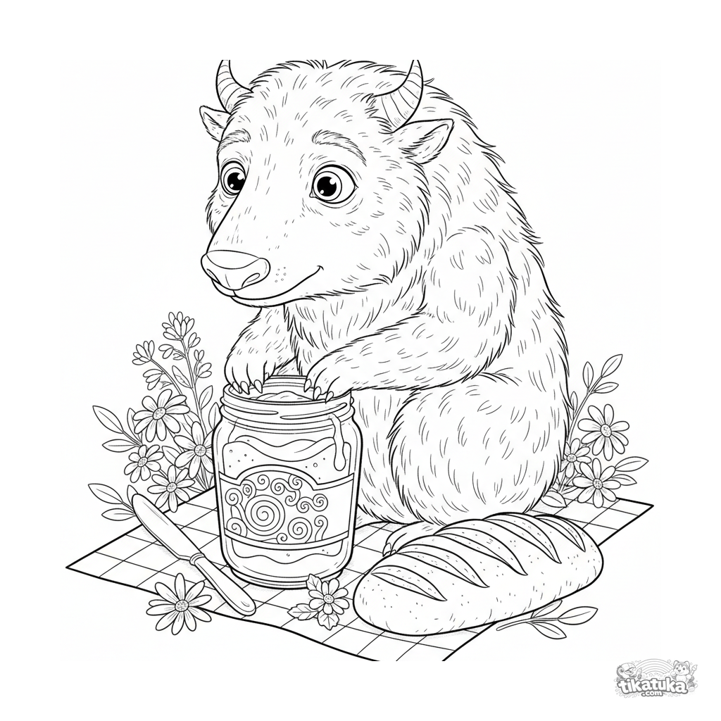 Detailliertes Ausmalbild im realistischen Stil: Ein pelziges Monster untersucht neugierig ein Marmeladenglas auf einem Picknick. Für Kinder von 10-12 Jahren, mit Texturen und mehreren Elementen.