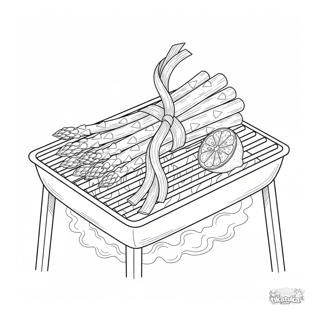 Ausmalbild für ältere Kinder 10-12 Jahre: ein realistisches Bündel Spargel mit Zitrone auf einem Gartengrill.