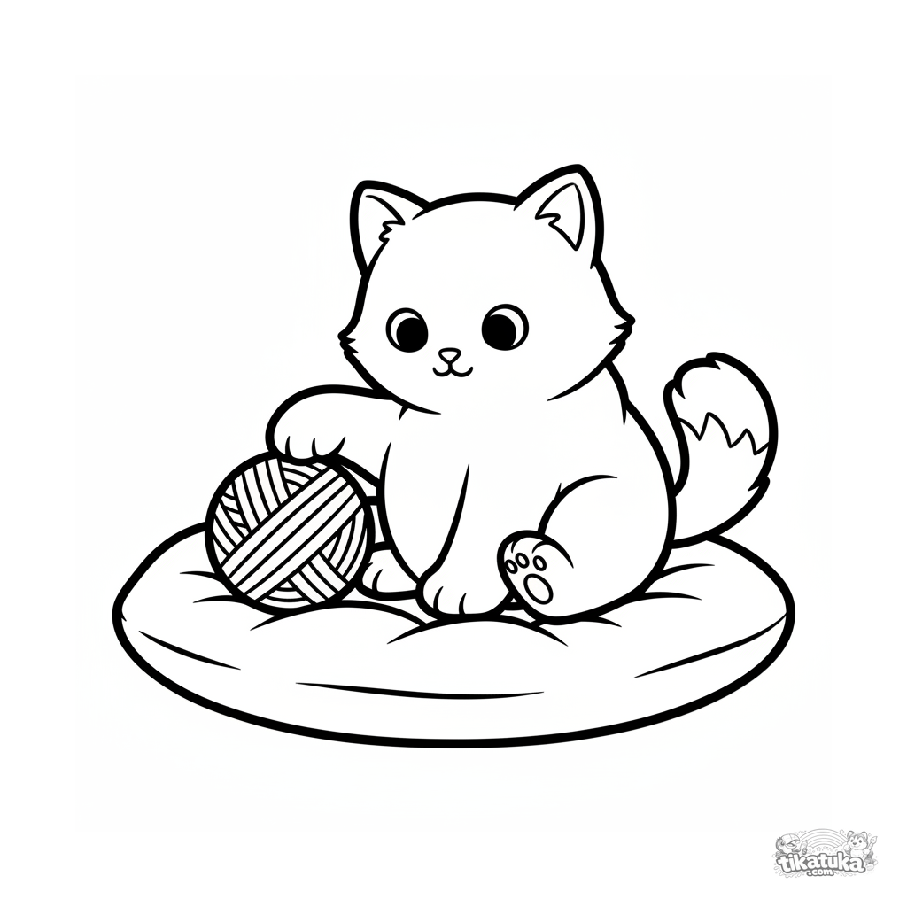 Realistisches Ausmalbild für Kleinkinder: ein Kätzchen spielt mit einem Wollknäuel auf einem Kissen. Vereinfachte Umrisse, große Formen, für 2-3 Jahre.