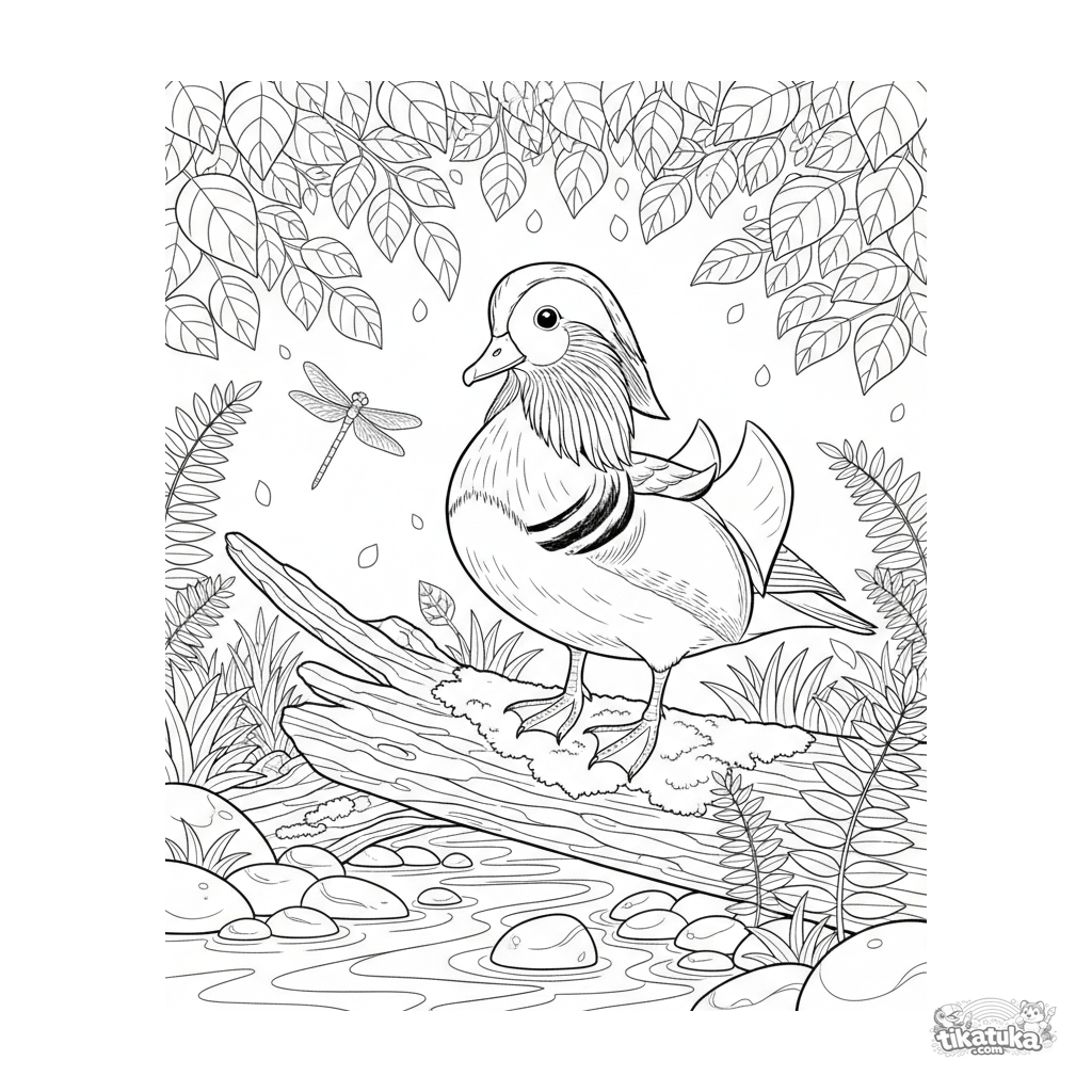 Detailliertes Ausmalbild einer Mandarinente auf einem moosigen Baumstamm an einem Waldbach. Für ältere Kinder von 7-12 Jahren. Zeigt das komplexe Gefieder des Vogels.